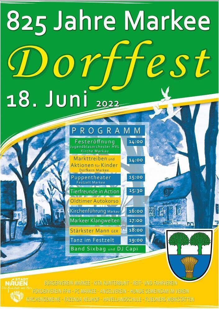 Mitglieder des Festkomitees: Bürgerverein Markee - Kita Kunterbunt - Reit- und Fahrverein - Förderverein FFW - FC Markee - Angelverein - Hunde gemeinsam im Verein - Kirchengemeine - Fazenda Gut Neuhof - Havellandschule - Fliedners Werkstätten Markau